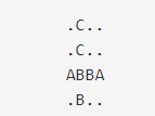 두 단어 A와 B가 주어진다. A는 가로로 놓여야 하고, B는 세로로 놓여야 한다. 또, 두 단어는 서로 교차해야 한다. (정확히 한 글자를 공유해야 한다) 공유하는 글자는 A와 B에 동시에 포함되어 있는 글자여야 하고, 그런 글자가 여럿인 경우 A에서 제일 먼저 등장하는 글자를 선택한다. 마찬가지로 이 글자가 B에서도 여러 번 등장하면 B에서 제일 처음 나오는 것을 선택한다. 예를 들어, A = "ABBA"이고, B = "CCBB"라면, 아래와 같이 만들 수 있다.