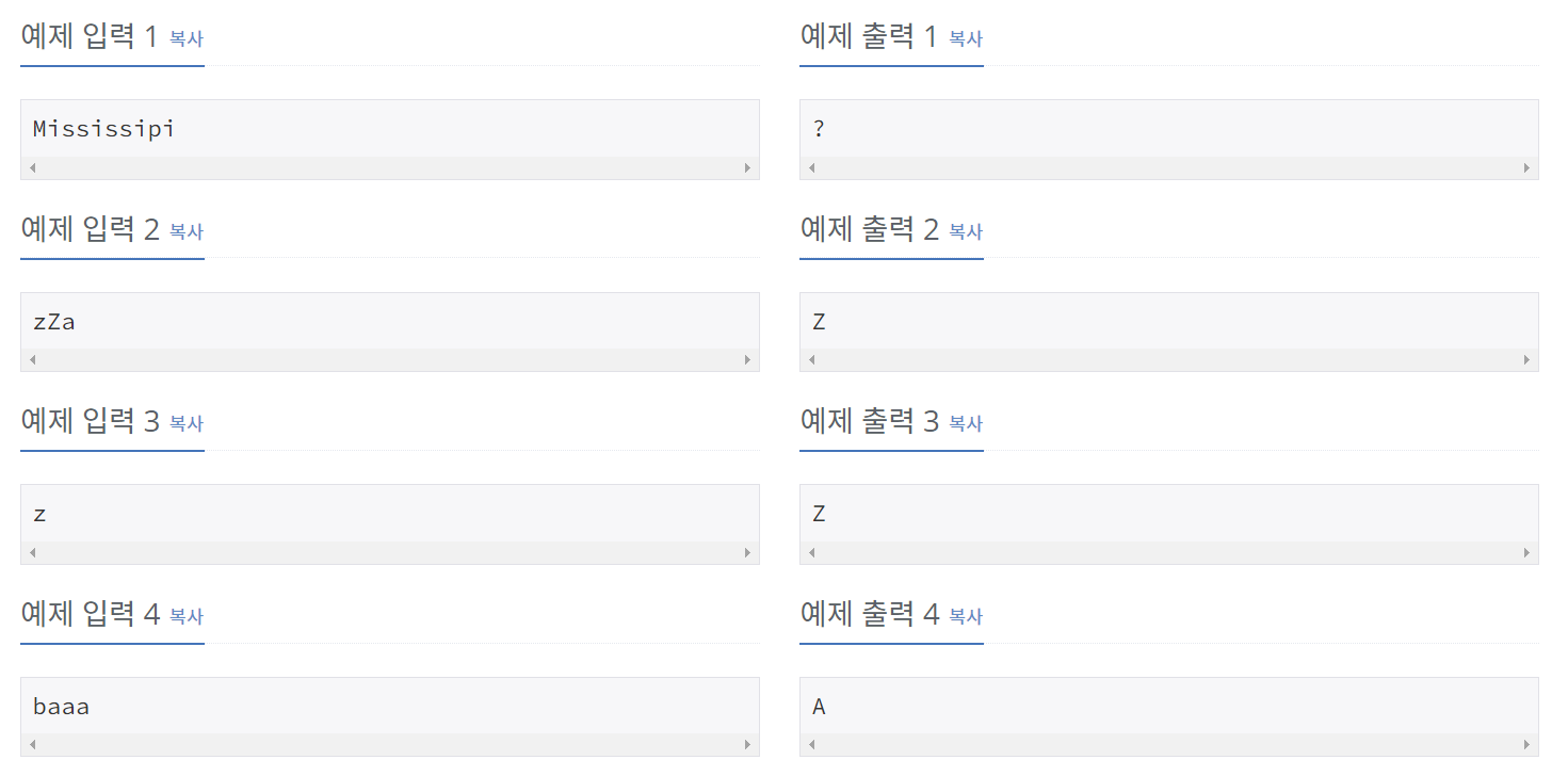 첫째 줄에 이 단어에서 가장 많이 사용된 알파벳을 대문자로 출력한다. 단, 가장 많이 사용된 알파벳이 여러 개 존재하는 경우에는 ?를 출력한다.