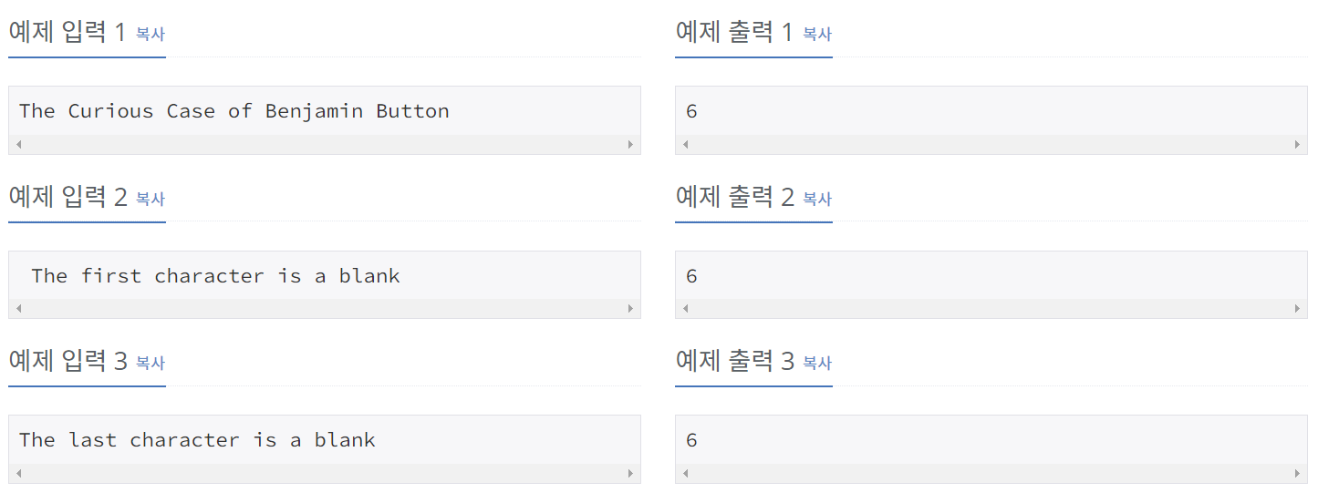 이 문제의 정답률이 무려 29%이다. 처음에는 이게 뭐지? 싶었고, 막상 풀고나니 이렇게 쉬운데??라고 생각을 해서 제출을 하니 '틀렸습니다!' 라고 떴다. 그 후 2번 더 시도했음에도(위의 처음 코드는 출력초과..) 계속 풀지 못해서 다른 분들의 코드를 참고하였다. 대부분 split()을 사용하셨다.(split은 사실 한 줄로 끝낼 수 있다. 최종코드3) 나는 처음과 마지막 공백을 다 없앤 후, 공백의 갯수를 세 1을 더해주는 방법으로 하고 싶어 strip()으로 사용하는 방식을 찾고 싶었고 참고해서 만든 것이 최종 코드 1이다. 처음 코드는 왜 출력초과가 떴을까 생각을 하던 중, 맨 처음에 길이가 0인 것은 0을 출력하고 끝내야하는데, 모든 입력값을 매번 if문과 for문을 다 돌려버리니 아마 출력초과가 나오지 않았을까 싶다. 그래서 else로 똑같은 처음 코드1의 for문을 넣으니 이것(최종 코드2) 또한 통과를 했다. 하지만 시간이 최종 코드1보다 2배가량 긴 거 보니 굳이 for문을 할 필요없이 최종 코드 1처럼 count로 처리하는 것이 베스트인 것 같다. 이래서 다양한 코드를 확인해야 하나보다.