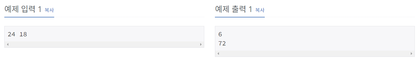 첫째 줄에는 입력으로 주어진 두 수의 최대공약수를, 둘째 줄에는 입력으로 주어진 두 수의 최소 공배수를 출력한다.