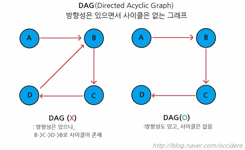 DAG(Directed Acyclic Graph)그래프여야 함. 방향성이 있고, 사이클이 없는 그래프