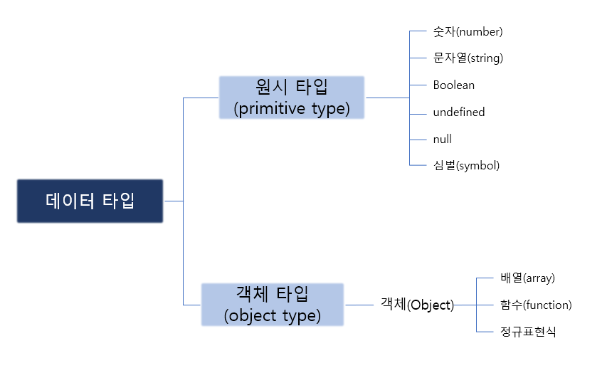 자바스크립트는 7개의 데이터 타입을 제공한다. 이 데이터 타입은 원시 타입과 객체 타입으로 구별된다.