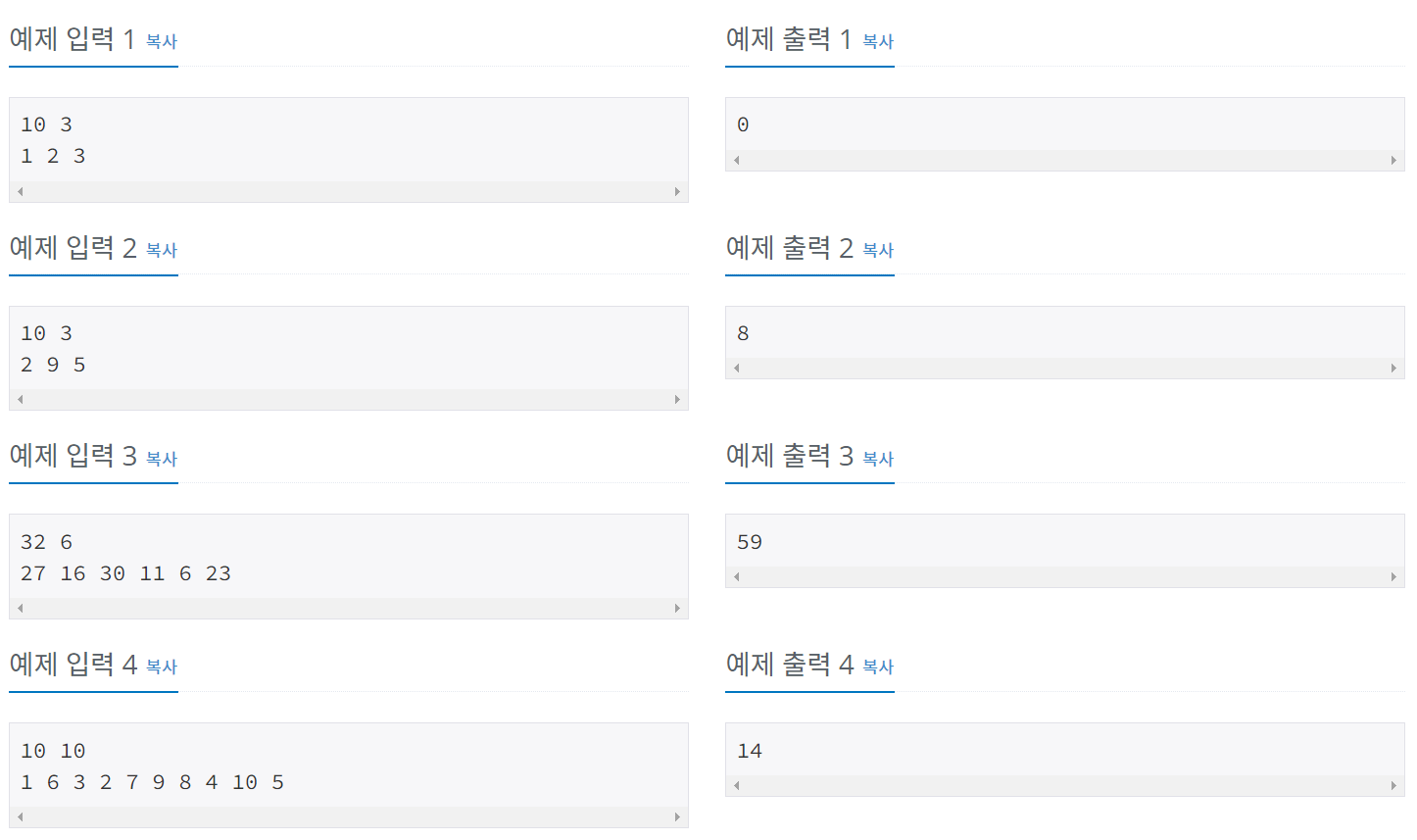 첫째 줄에 큐의 크기 N과 뽑아내려고 하는 수의 개수 M이 주어진다. N은 50보다 작거나 같은 자연수이고, M은 N보다 작거나 같은 자연수이다. 둘째 줄에는 지민이가 뽑아내려고 하는 수의 위치가 순서대로 주어진다. 위치는 1보다 크거나 같고, N보다 작거나 같은 자연수이다.