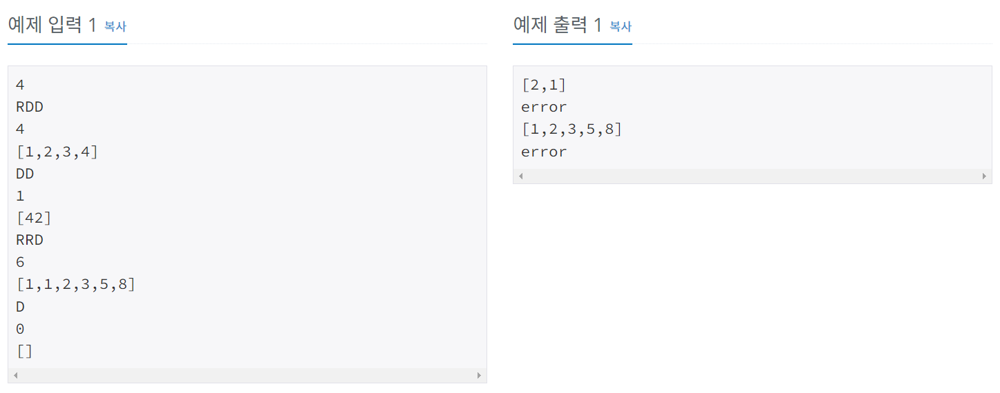 함수 R은 배열에 있는 수의 순서를 뒤집는 함수이고, D는 첫 번째 수를 버리는 함수이다. 배열이 비어있는데 D를 사용한 경우에는 에러가 발생한다.