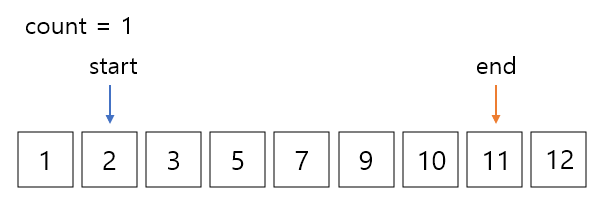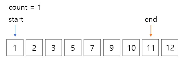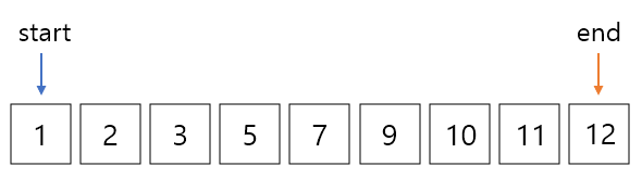 여기서 start 값과 end 값의 합은12로 13보다 작기 때문에 start를 오른쪽으로 한칸 이동해준다.