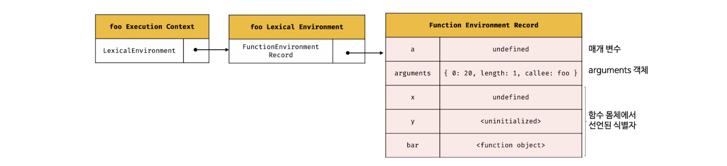 함수 렉시컬 환경을 구성하는 컴포넌트 중 하나인 함수 환경 레코드는 매개변수, arguments 객체, 함수 내부에서 선언한 지역 변수와 중첩 함수를 등록하고 관리한다.