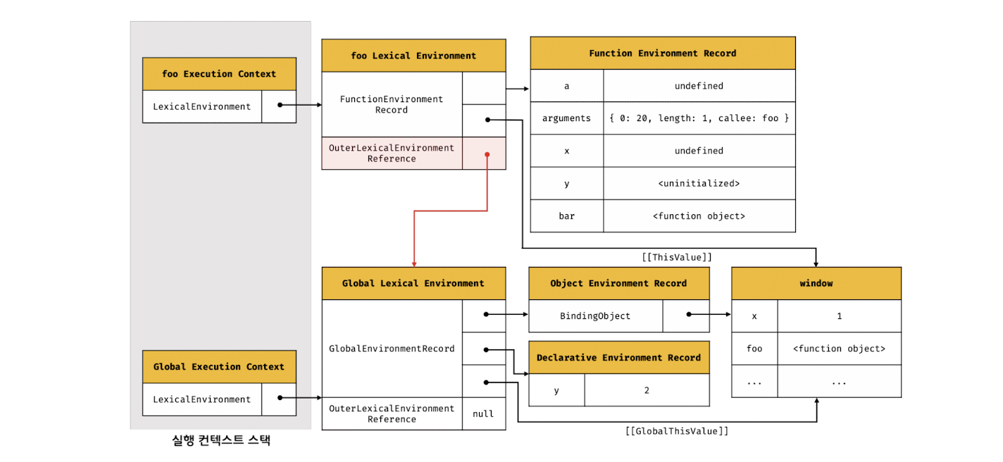 외부 렉시컬 환경에 대한 참조에는 foo 함수 정의가 평가된 시점에 실행 중인 실행 컨텍스트의 렉시컬 환경의 참조가 할당된다.