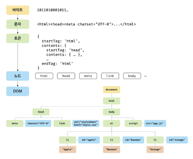 브라우저의 요청에 의해 서버가 응답한 HTML문서는 문자열로 이루어진 순수한 텍스트다. 순수한 텍스트인 HTML 문서를 브라우저에 시각적인 픽셀로 렌더링하려면 HTML 문서를 브라우저가 이해할 수 있는 자료구조(객체)로 변환하여 메모리에 저장해야 한다.