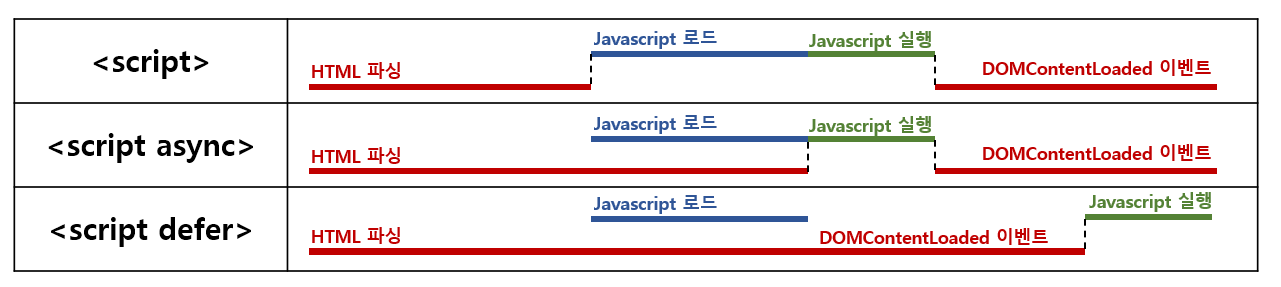 HTML 파싱과 외부 자바스크립트 파일의 로드가 비동기적으로 동시에 진행된다. 단, 자바스크립트의 파싱과 실행은 자바스크립트 파일의 로드가 완료된 직후 진행되며, 이때 HTML 파싱이 중단된다.